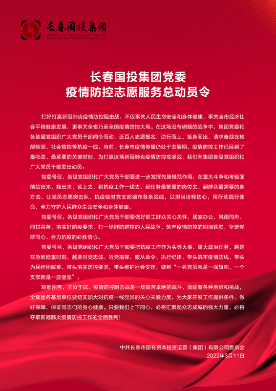新一轮疫情突然袭来,为长春这座城市按下了“暂停键”——企业停工、商场停业、学校停课、公交地铁停运……敌临城下,一场城市“保卫战”被迫打响!战役中有这么一群人,他们挺身而出,勇敢出击,成为这座城市最美的“逆行者”,给这个初春逢雪、乍暖还寒的时节带来最大的温暖和感动,让正在经历磨难的城市闪耀着“志愿红”,他们就是新时代“最美国投人”——长春国投抗疫一线志愿者服务队。