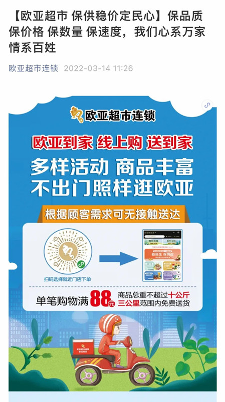 超市工作人员重点介绍了欧亚商业连锁精心打造的购物小程序——“欧亚到家”线上商城,只要在门店附近3公里范围内、重量不超过10公斤,单笔订单满88元即可免费配送到小区门口。欧亚超市连锁还特别上线了100元、200元、300元防疫保供蔬菜包,线上预订,线下自提或配送到小区门口,为抗疫期间民生保障发挥了作用,贡献了力量。
