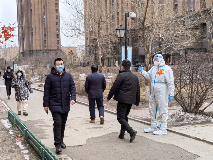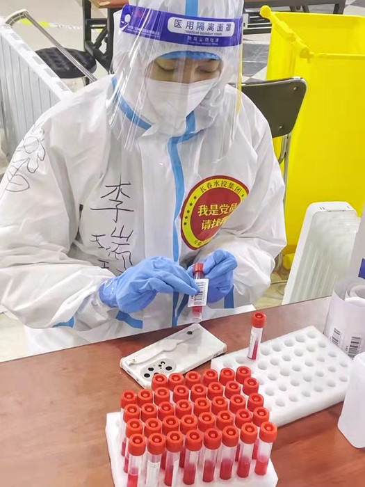 3月16日,社区紧急安排全队支援到工作难度最大的亚泰梧桐公馆小区。这是7000多人的小区,即使水投集团志愿服务者充实其中,人手还是严重不足。队员们以一充十,投入战斗。在梧桐公馆连续三天的核酸检测中,志愿者被派到配合医护进行扫码登记工作,紧急培训过后,他们站在了登记处开始工作。每天十几小时的工作,他们都要完成超2000人的扫码登记工作,遇到不会用手机的老人还需帮他们用身份证一遍遍录入,几个小时后整个人身体都变木了,手也开始变麻。有一次,在检测过程中扫到一居民是红码,他们一边在医生的指导下迅速更换防护服,一边按流程进行现场消毒。虽然他们心里也很紧张,但他们冷静处理,没有引起现场人员恐慌,重新组织秩序,继续扫码工作体现出了志愿者应有的应急素养。