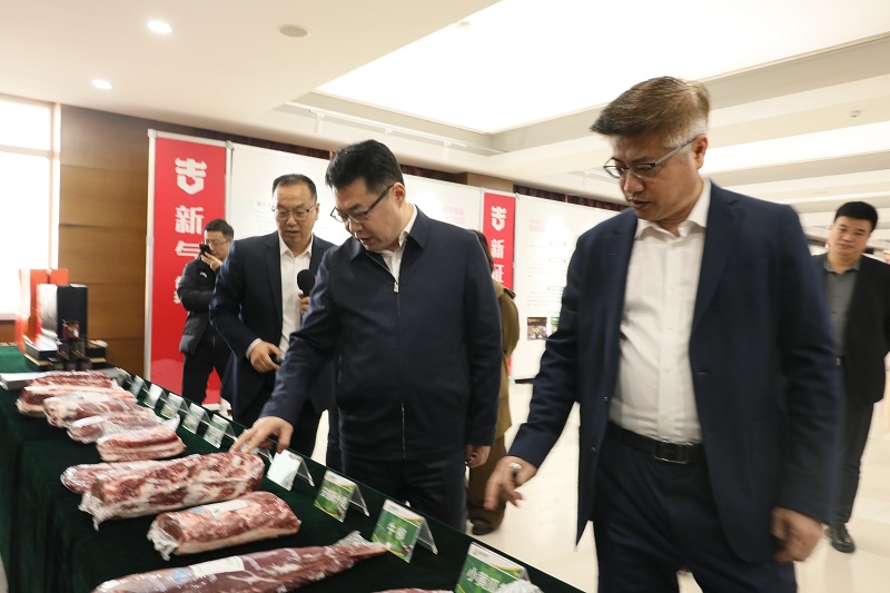 调研组一行首先在城开农投集团八楼会议中心听取了集团重点子企业城开畜牧公司的情况汇报,公司负责人结合企业宣传片、宣传展板、园区实时监控影像向调研组全面介绍了园区建设规划、养殖加工、品牌营销等内容,现场展示了现代化数据养殖智慧系统和部分牛肉产品、罐装食品。